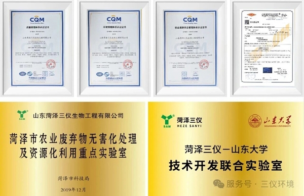 菏泽三仪已顺利通过 ISO9001 质量管理、ISO14001 环境管理、ISO45001 职业健康安全管理三大体系认证及欧盟CE认证,以高标准管理体系护航企业高质量发展。企业于农业废弃物无害化处理与资源化利用方向取得了亮眼成效。在技术应用端,节能技术采用优化设计的生物反应系统,降低了近半的每吨畜禽粪便的处理电耗,既节约了大量能源,又减少了二氧化碳排放,为国家“双碳” 目标落地贡献了硬核力量。此外,公司还组建了 “菏泽市农业废弃物无害化处理及资源化利用重点实验室”,并与多所高校深化产学研合作,持续为技术创新与产业升级赋能。